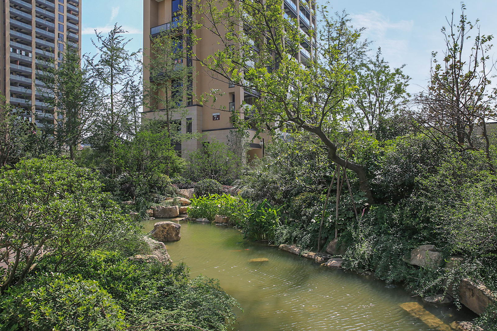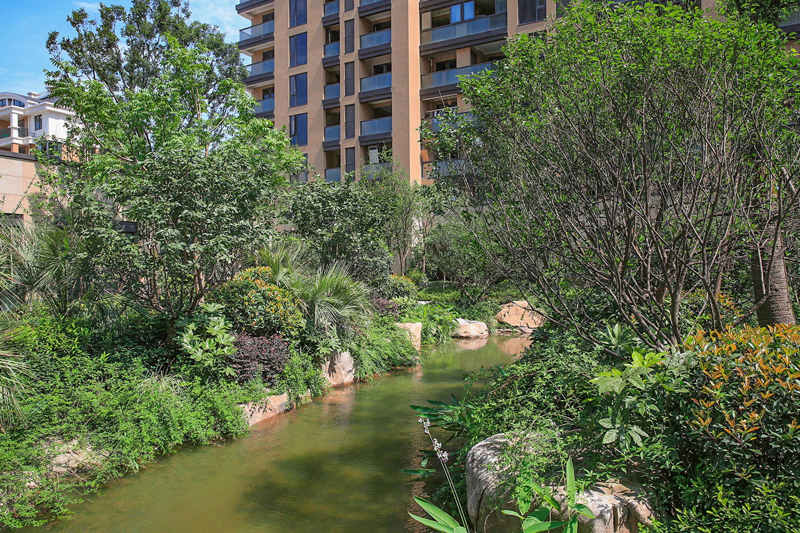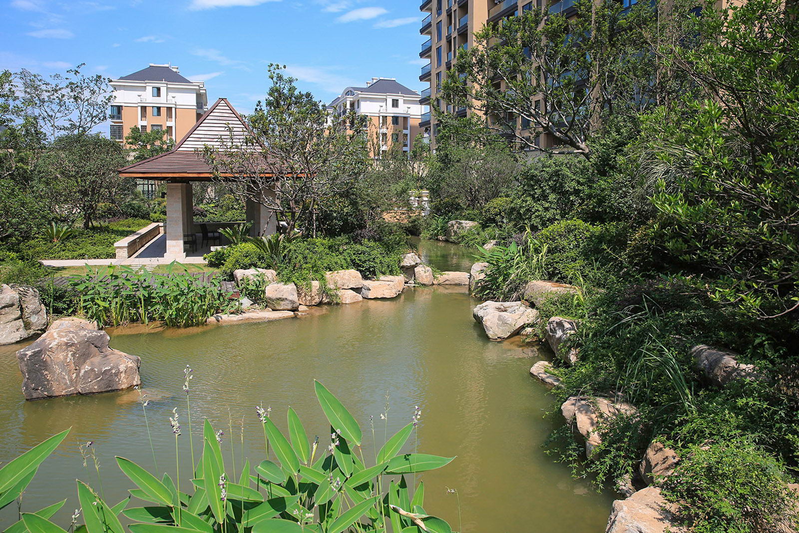 婉約的水系靈動變化,植物沿用東南亞風情配置手法,自然野趣,營造一種氛圍極其輕松的,溫潤、自然的都市野奢性生活場景。