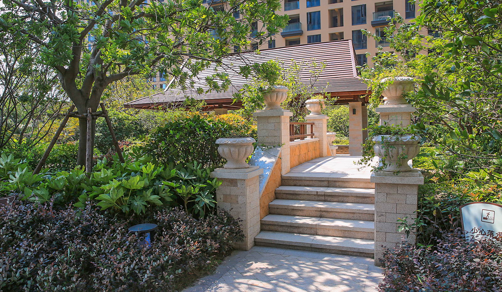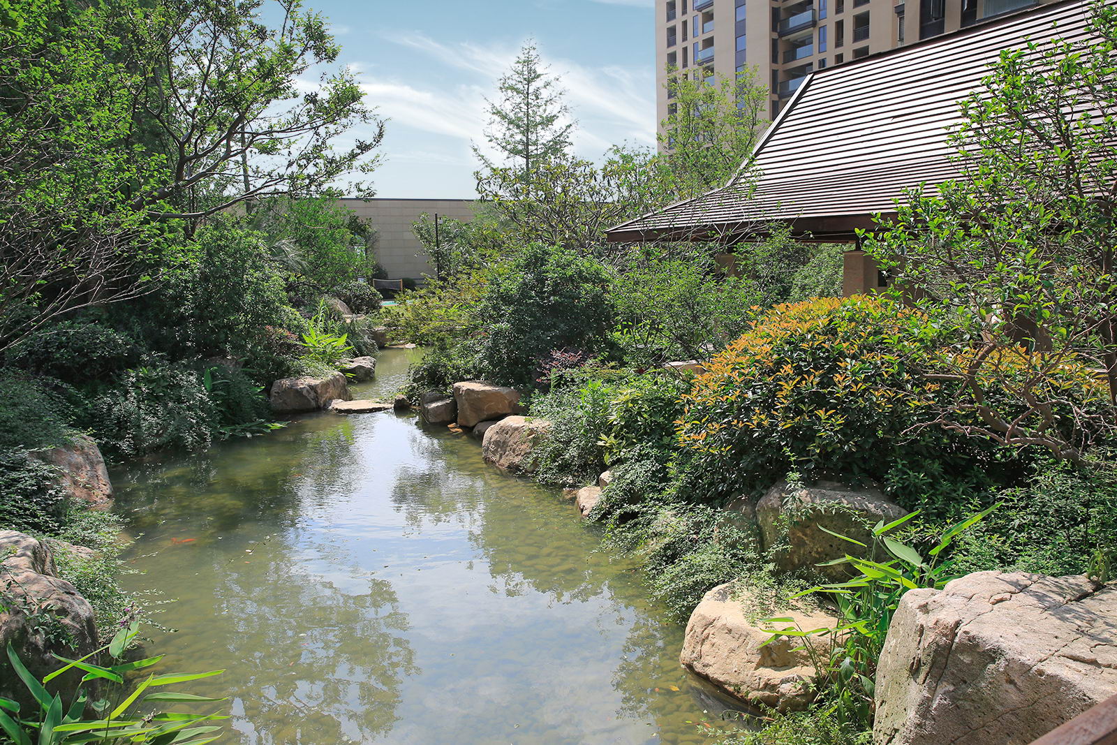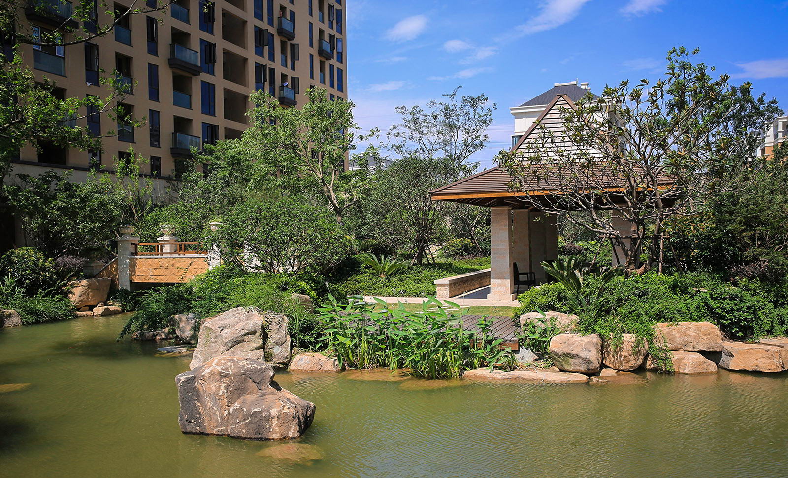 婉約的水系靈動變化,植物沿用東南亞風情配置手法,自然野趣,營造一種氛圍極其輕松的,溫潤、自然的都市野奢性生活場景。