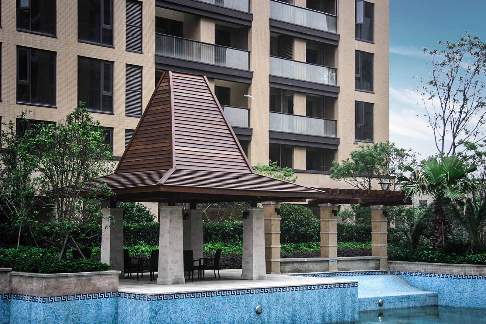 優(yōu)雅的度假泳池,每到夏令時,吸引業(yè)主紛紛走出室內(nèi)空調(diào)房,投身到蔚藍水世界,放松身心。