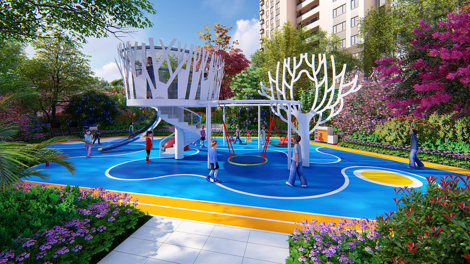 兒童樂園以親子同樂,喜鵲和鳴為意境,設置兒童體驗熱點,同時布置家長休閑看護區與洽談區,園路旁的喬木夾道種植,豐富的綠化層次,都能增強客戶對項目品質更加直觀的感受。
