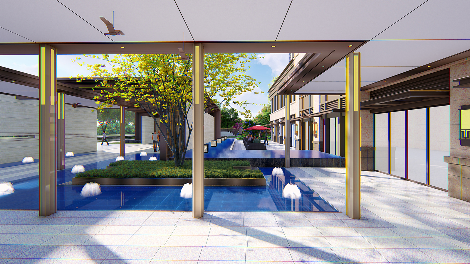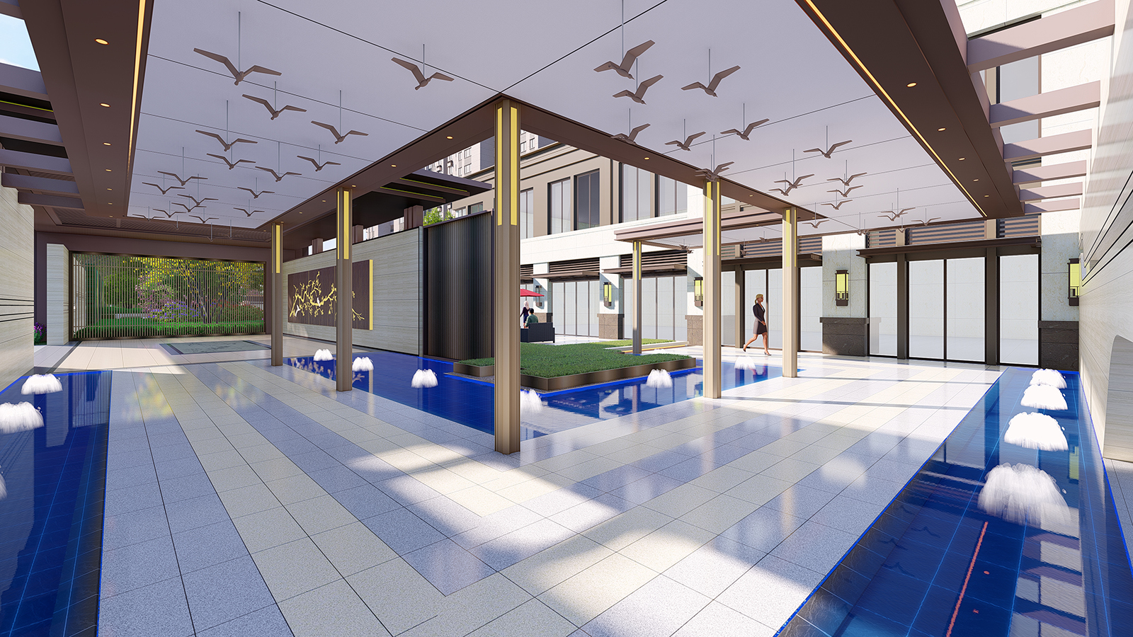 迎賓廣場平坦開闊,疊水水景與臺階組合現代、精致、優雅,水景布置有鵲歸巢主題雕塑,禮迎業主歸家,彰顯小區尊享品質。