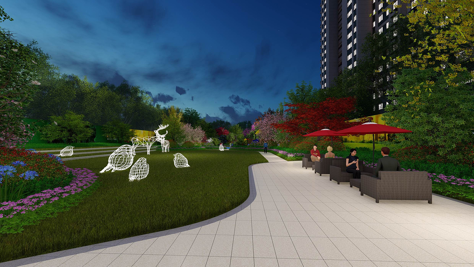 售樓部走出后園路上的對景,設置鵲影光華異形格柵景墻,優雅的光影關系,若隱若現的喜鵲小品,引導客戶進入景觀后場空間。