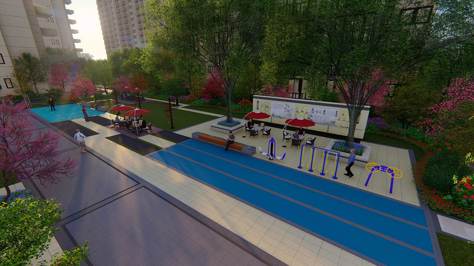 康樂主題區包含太極健身區、休閑靜養區、棋牌娛樂區、康樂健身區、康健卵石步道五大功能區,區塊設置在最為安靜雅逸地塊東南側,太極健身區在太極健身廣場設計太極點位,方便老人展開太極運動,通過對于金鄉當地生活習慣的深度調研,特別設計了棋牌娛樂空間,方便鄰里間在茶語飯后休閑時間,切磋棋牌游戲,將具有療養養生的性質的香花植物,開花喬木布置在在康健卵石步道兩側,提升老人的樂觀精神與生活活力,給老人創造一個極悠然、祥和、安寧的休憩、養生生活空間。