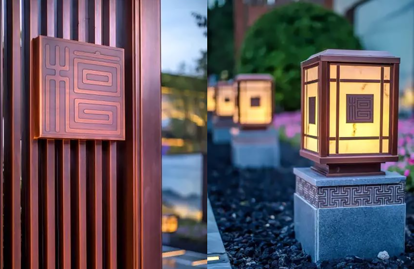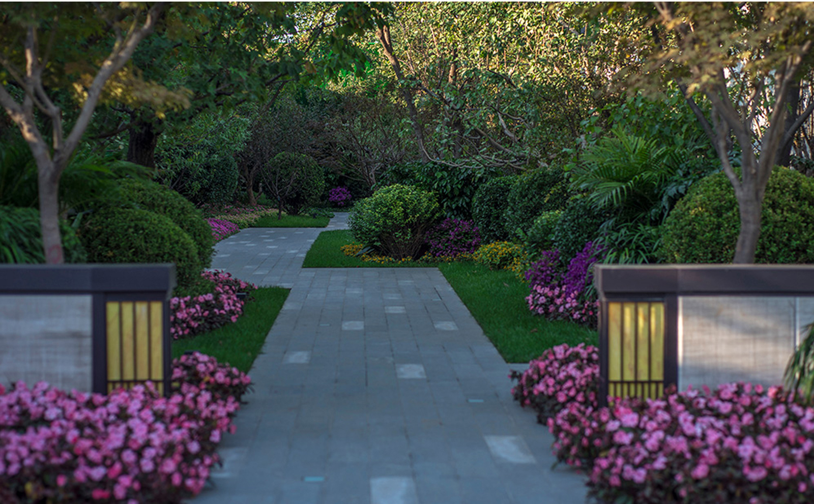 見禮檀園,府院初開,西入口門頭前場空間有限,景觀上采用 欲揚先抑的手法,以大禮東方、神韻在心為意境,將景觀在門頭后進一步表現,空間組織人車分流,中軸步道以“檀” 字紋為核心,兩側以云入境,如焚檀香以籠煙,林蔭清淺,天色清雅,業主歸家自然心境平和。