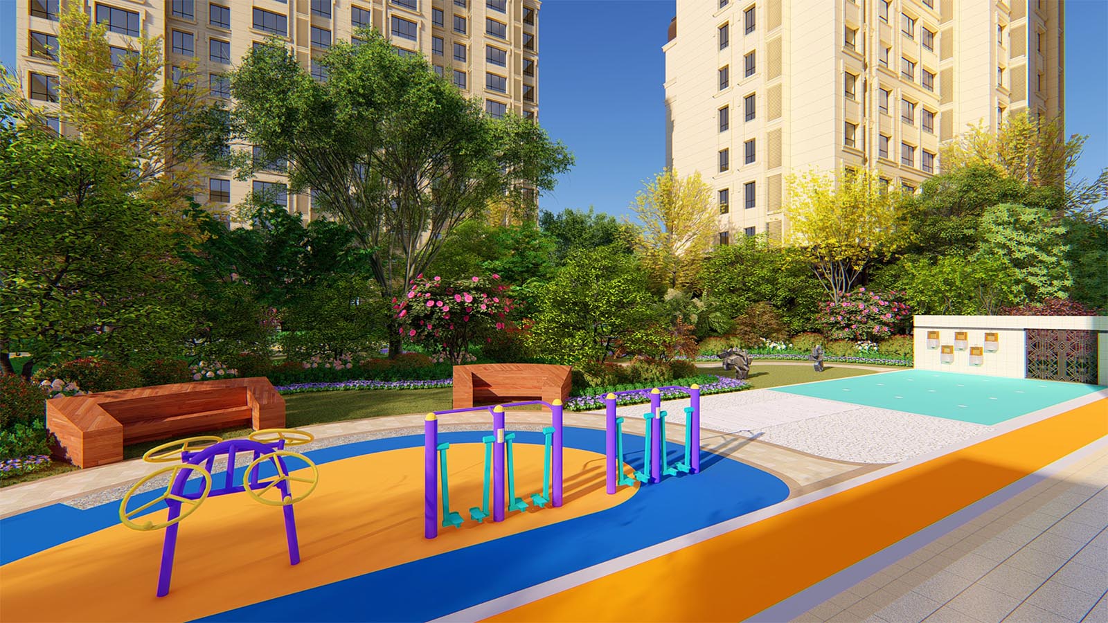 豐富的健身器械,成人在同一時間段將大量集中,形成共同參與的交融場所,創造更多社區業主自發交流的可能性,