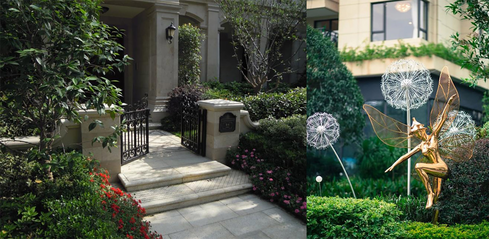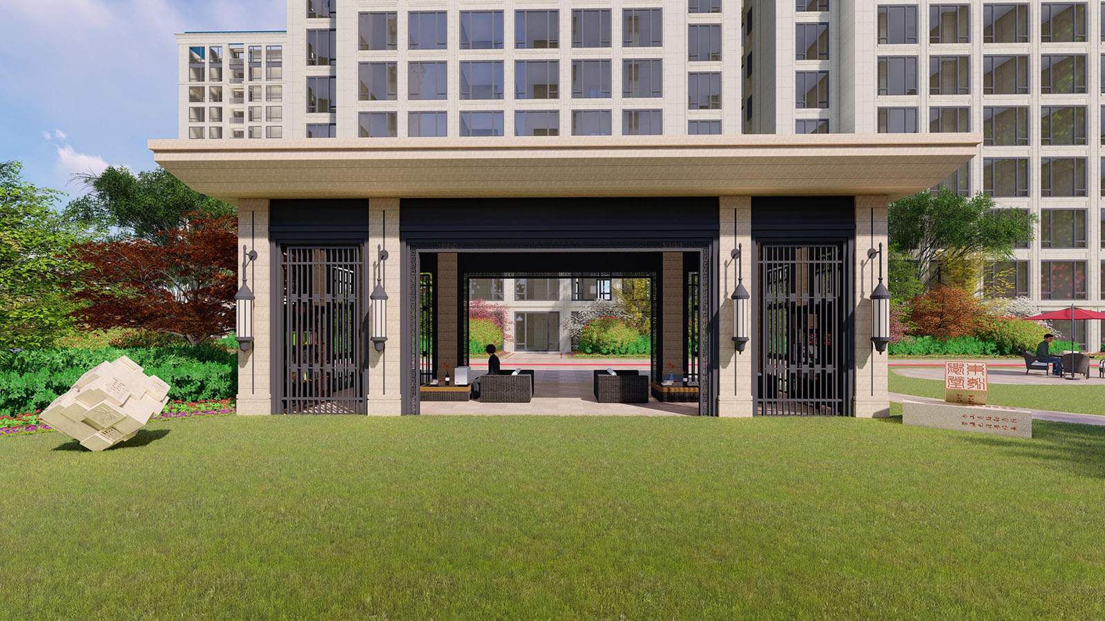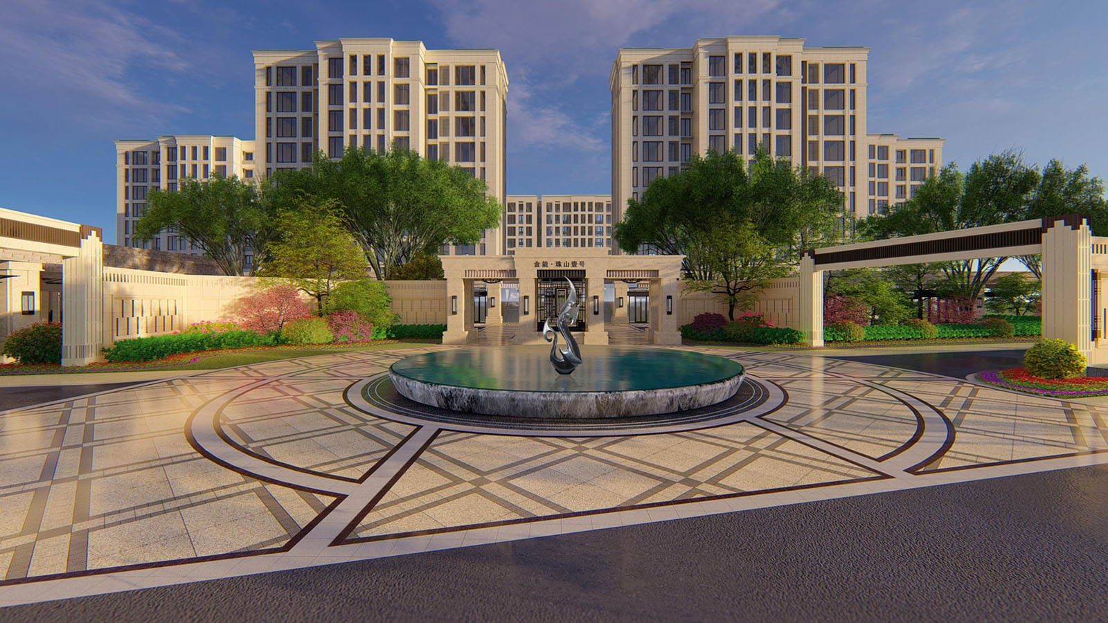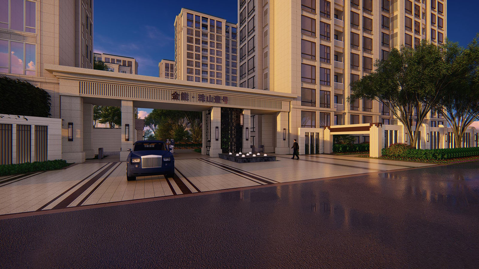 入口廣場的鋪裝線條、立面形象等風格延續建筑與景觀新古典的時尚與韻味,尊貴與雅致,石庫門與景墻結合設計,形成統一整體、雍容大氣的禮儀迎賓效果。