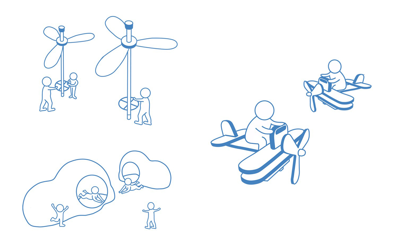 親子互動風車、夢幻飛行搖搖馬、云屋鉆洞概念圖