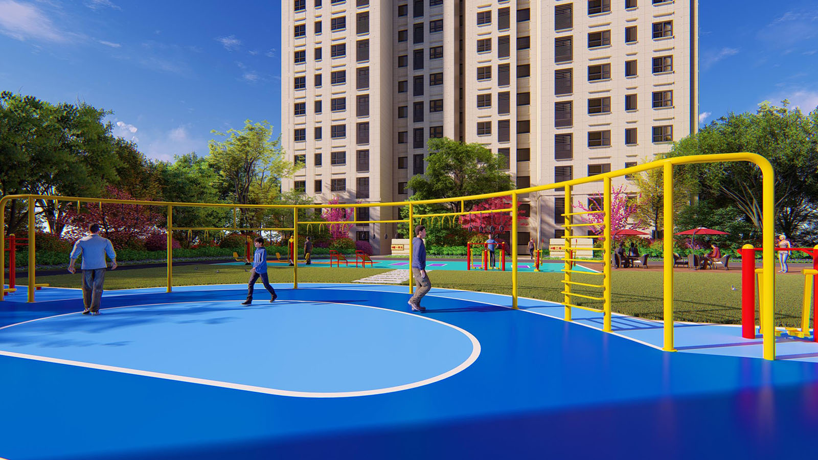 健身花園景觀上將其設置在地塊東北角隅,降低運動對居民的影響,設計綜合性的多功能成人健身場地,其核心目的就是讓這個空間、消防登高面可以更高效的利用,讓成人開展多種健身活動,為居民的健康提供堅實的設施基礎。
