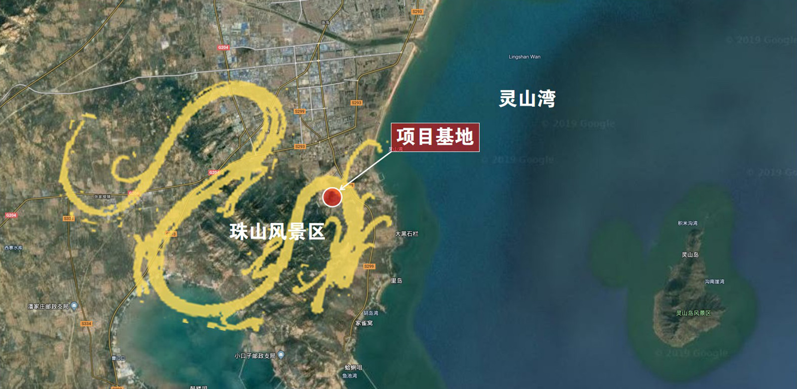 項目地塊西南靠山大珠山風景區,東面臨海靈山灣,紫氣東來,靈山風景區近在眼底,大珠山山脈自西向東,有祥龍走海,風水起興之勢,大空間上形成山環水抱、藏風聚氣的上風上水格局。