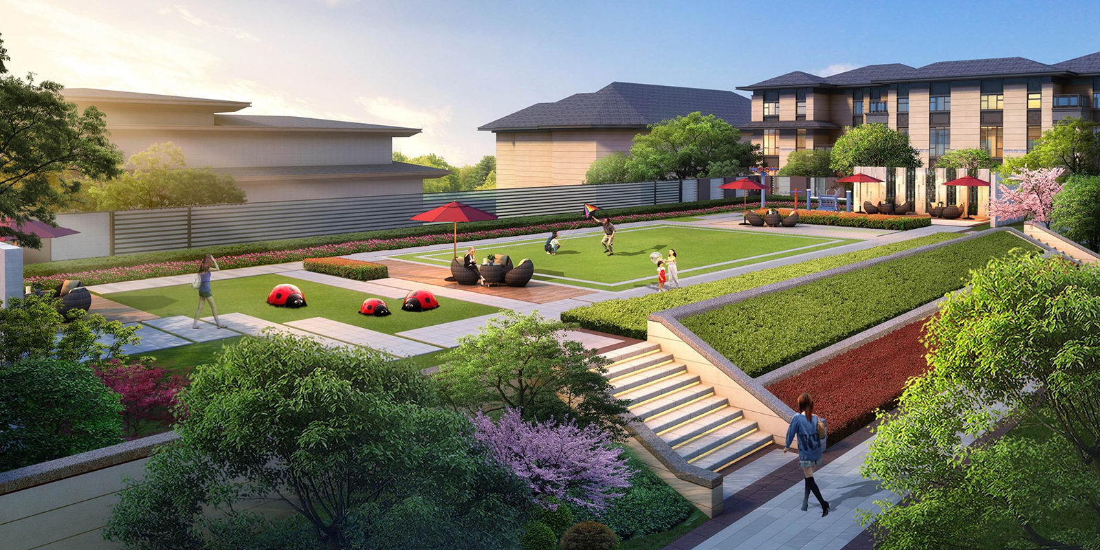 為屋頂花園營造“浮云之上,府院高堂”之意境,一層臺階,一層雍華,不畏浮云遮望眼,只緣身在最高層。屋頂之上四方美景盡收,強調空間與居者的氣度有容乃大,將屋頂有限空間放大到極致,所有豎向元素退至邊界,空間與天相呼應,因此陽光草坪設計為矩形,寓意天圓則地方,更加現代、雅致,將空間中心凸顯出來,營造極雅的空間意境。
