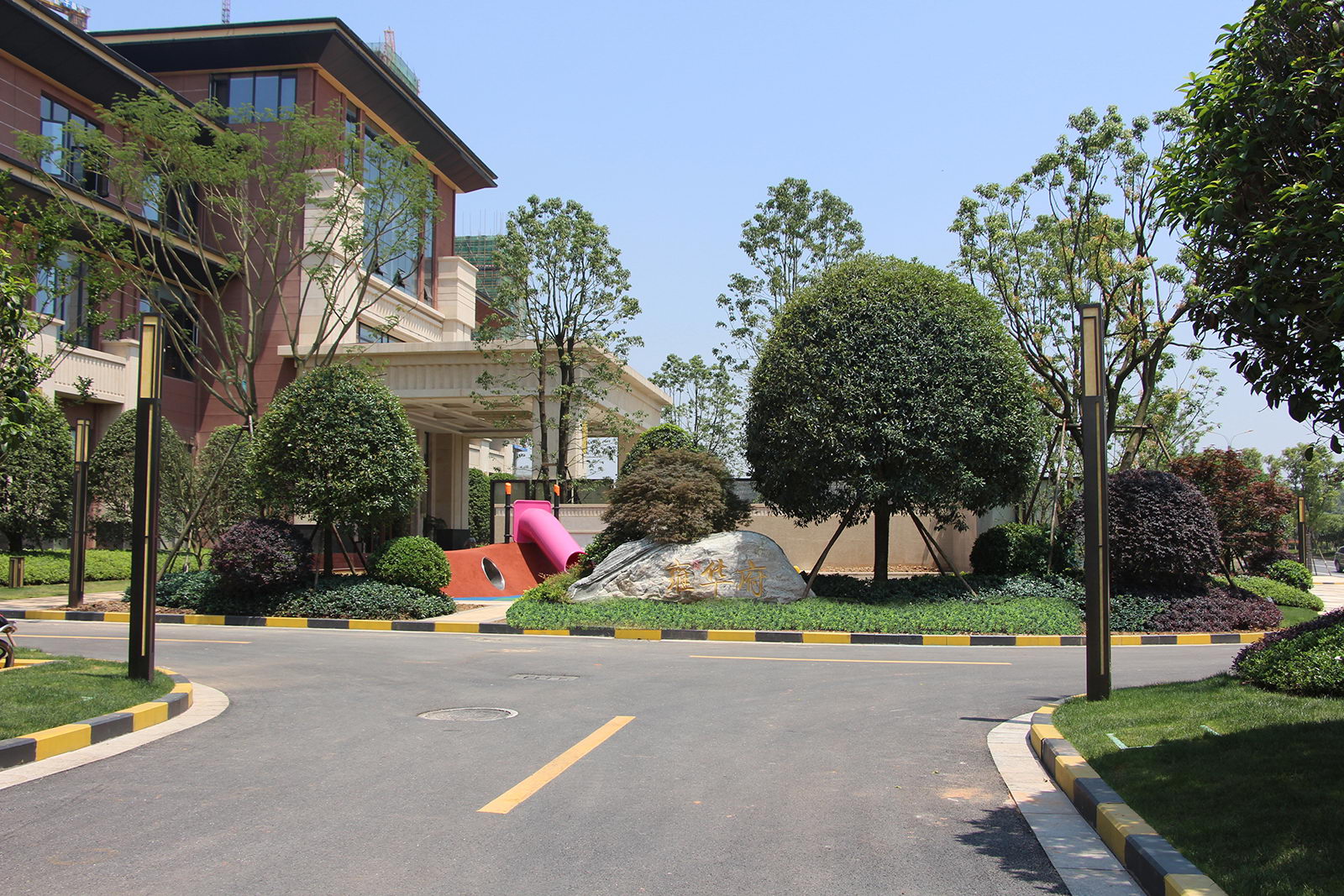 雍華府示范區前場景觀旨在賦予項目的精神展現力,要求景觀不光把東方人文融入到設計情景之中,而更重要的是,使客戶觸動于泱泱雍華府的寬廣與胸襟,氣魄與神定,為業主呈現新干最品質、最高端大宅的景觀奏章與禮獻。因此,在設計過程中,避免過于繁復的空間劃分,冗長迂回的流線組織,提倡景觀欲揚則揚,無藏勿抑,開門見山,大氣現世。