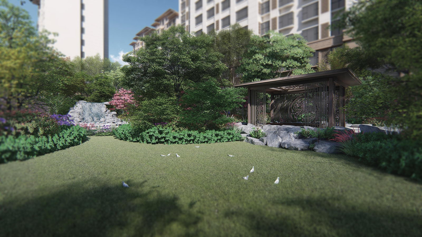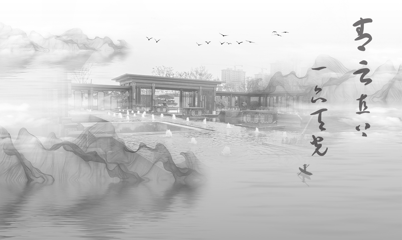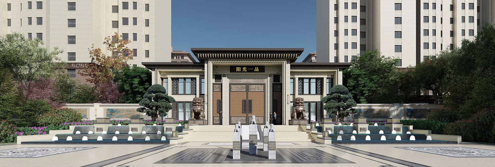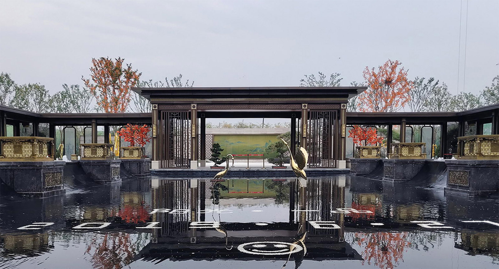 鏡面水景輕靈、優(yōu)雅、致韻;雙排四座宮燈雕琢萬(wàn)字符,寓意前程萬(wàn)福。
