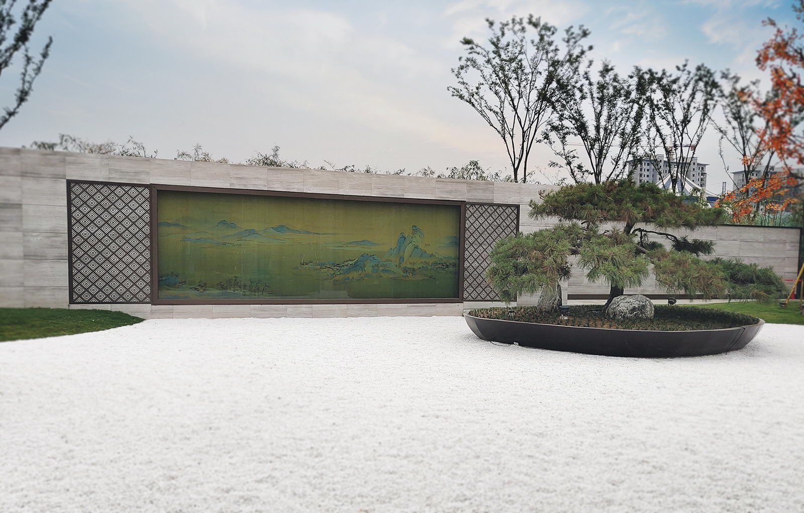 以山、水、亭、草坪的虛實(shí)變化描繪出一幅曠遠(yuǎn)之境 。
