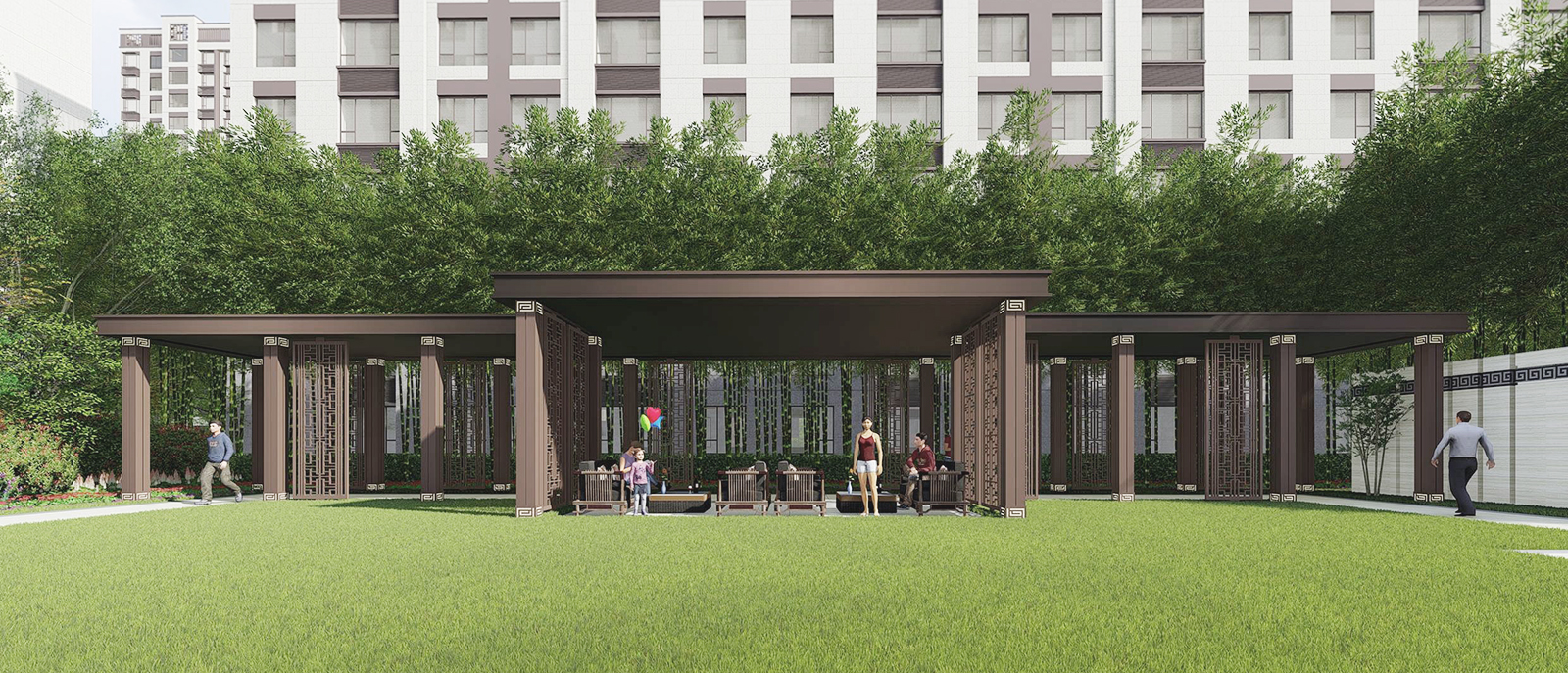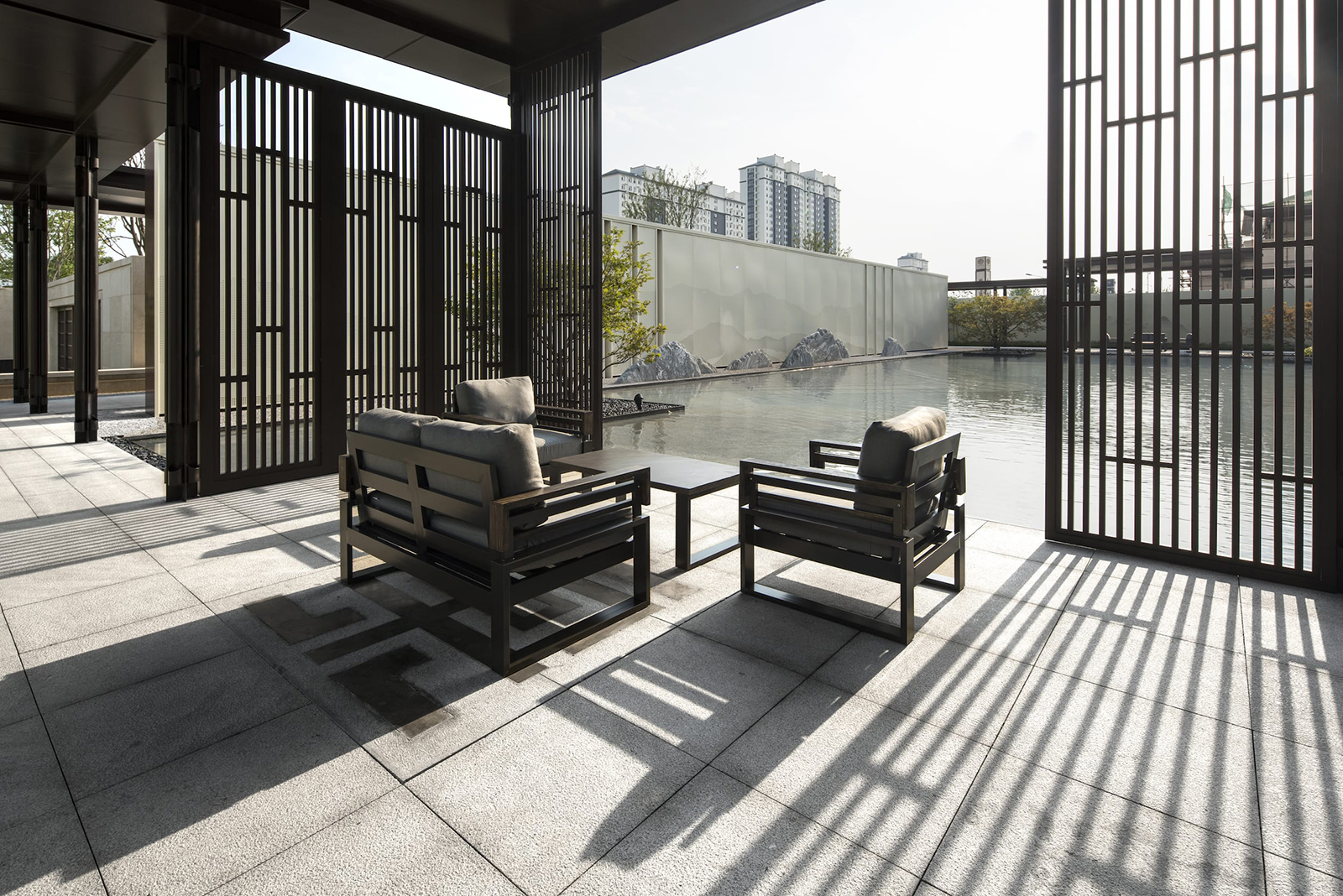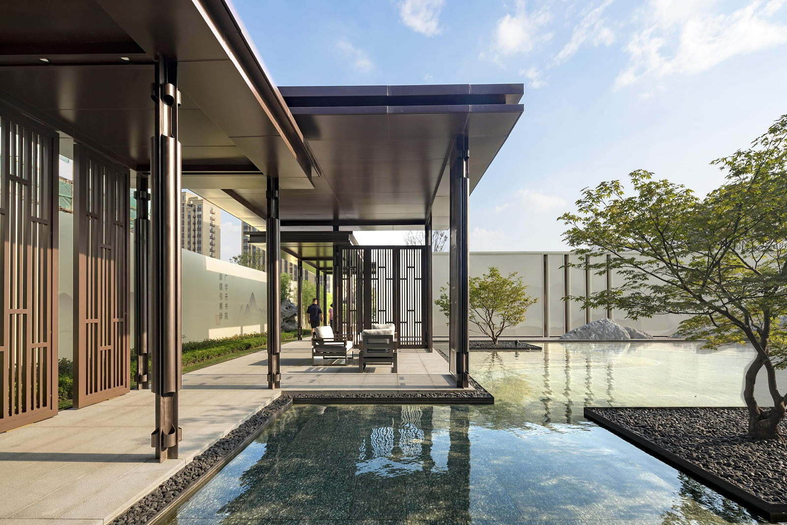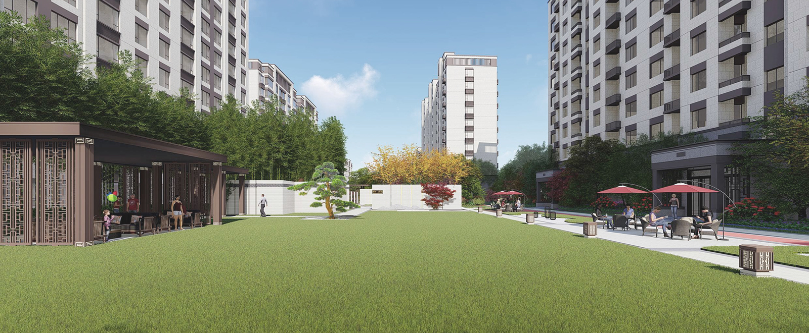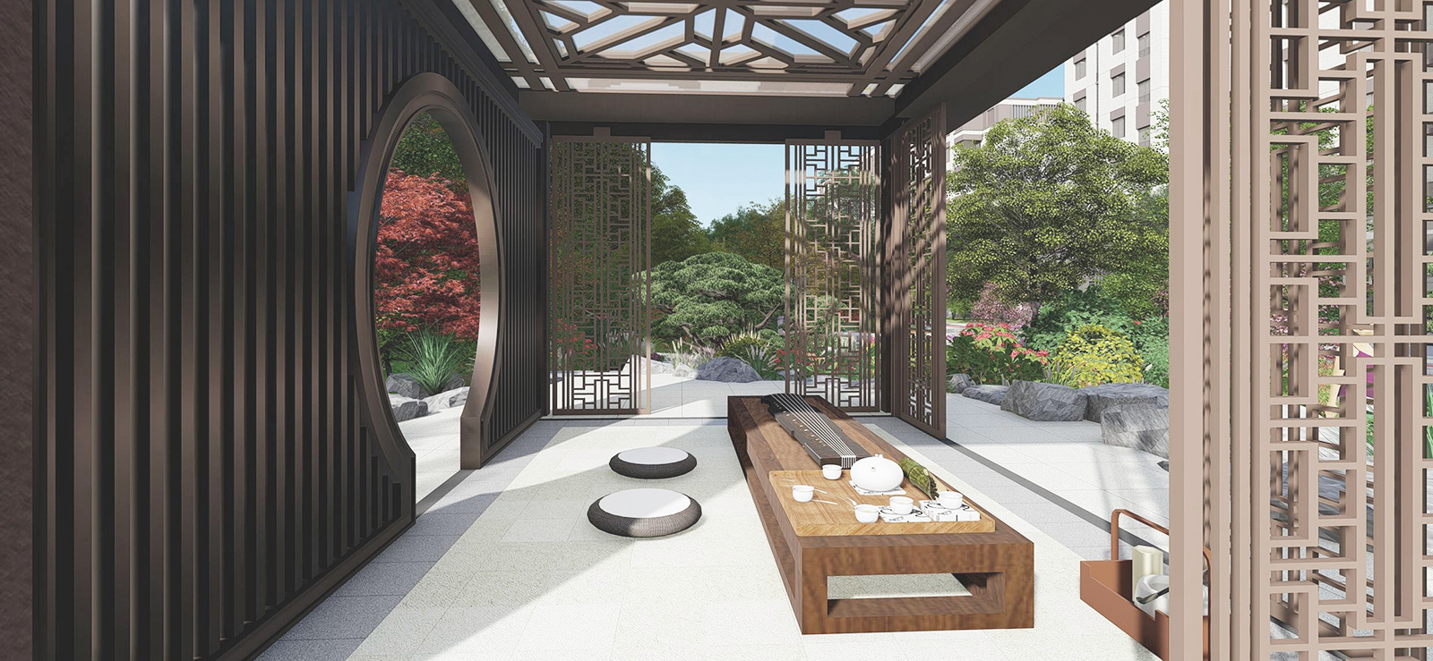在全區(qū)最為開闊,陽光最為充足的地段,自然而然,大氣舒緩的陽光大草坪,因時因地而生,在對景照壁虛實掩映之后,場地瞬間展開,追求極致的簡雅之中給業(yè)主帶來的是最溫暖的身心感受,再之后,又在一曲一折中將人引導(dǎo)之山水園,整個二進院作為景觀會客中庭,會客、訪友,三五知己,闊談人生,閑適愜意。