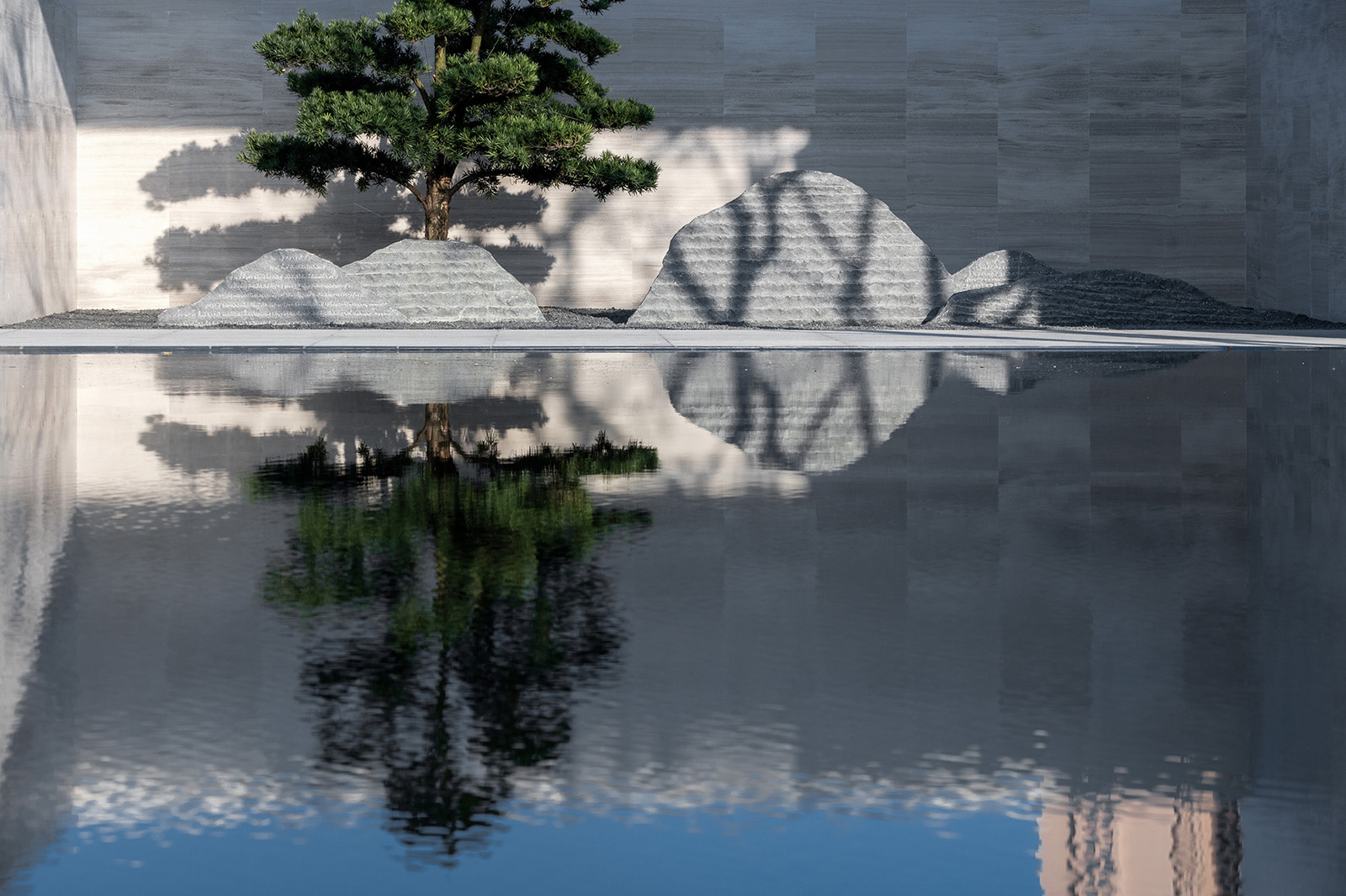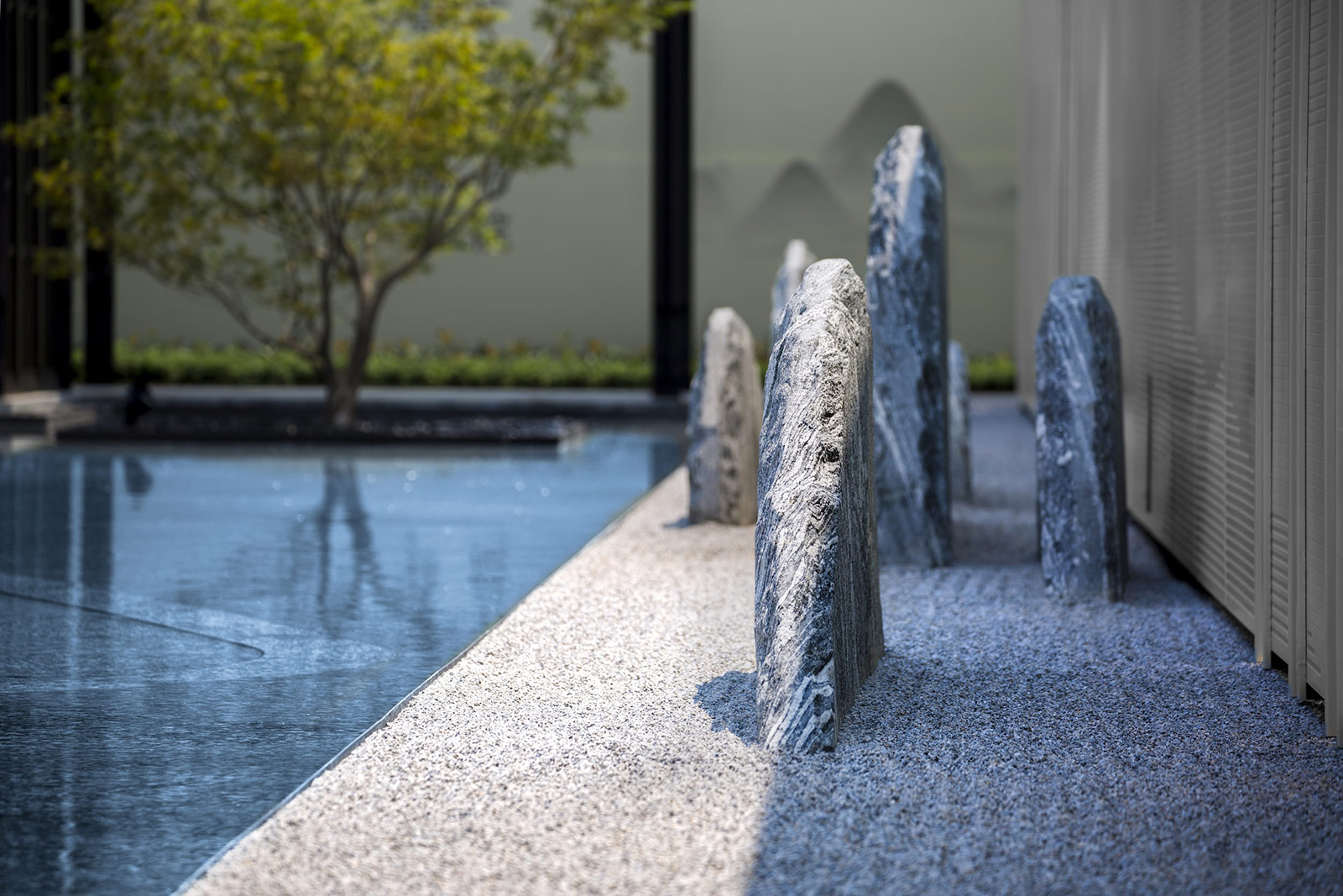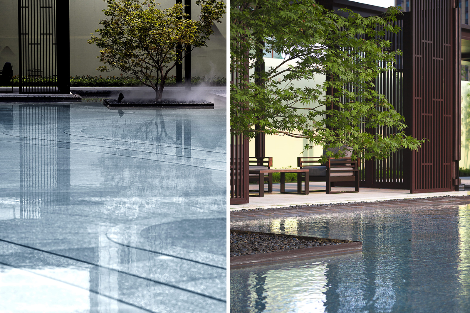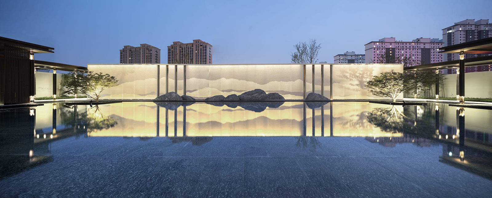 “水利萬物而不爭”,入口府門與造型景石疏導(dǎo)人車動線,以“迎·入境壺天,禮·天宇空明——境·圖云境水”為展示序列,層層遞進。可所謂“入則壺天自春”,清凈悠然。對景景墻巍峨大氣,通過風(fēng)雨連廊,見中軸線大尺度水景,如銀河望月,藏風(fēng)納氣。水景曲線如群山往復(fù),流水潺潺,禮儀燈光步道,靜謐舒心,大氣、精致、從容。